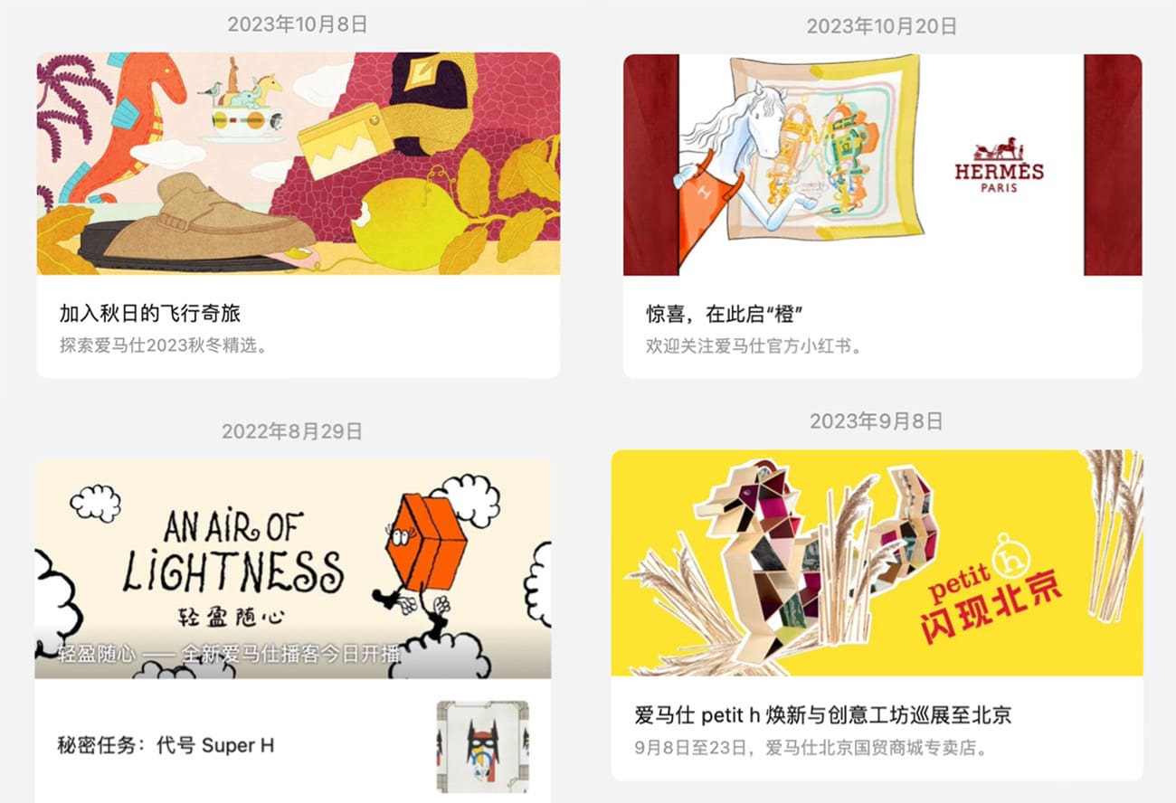 The Hermès brand continues to focus on ‘carefully crafted essentials’, featuring elegant designs with balanced yet vibrant creative directions. Text and brand tonality are more graceful and understated than those of their competitors, and the brand has typically avoided the use of flamboyant popular athletes, pop musicians, and top actors. Social media campaigns often focus on Hermès’ product quality, luxurious natural beauty, unique design elements, and charming expressions of contemporary quiet luxury. Hermès often combines hand-drawn illustrations and simple, clever animations with exquisitely art-directed photos and simple, clever videos.